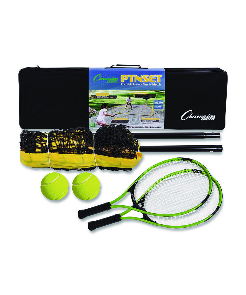 The Champion Sports Tennis Net Set is a portable instant tennis match set that allows you to set up a full-size court wherever and whenever you need it. This set is ideal for building skills and backyard fun. Quick to set-up and easy to take down, the entire portable system fits easily into a durable nylon carry bag for convenient storage and transport.
