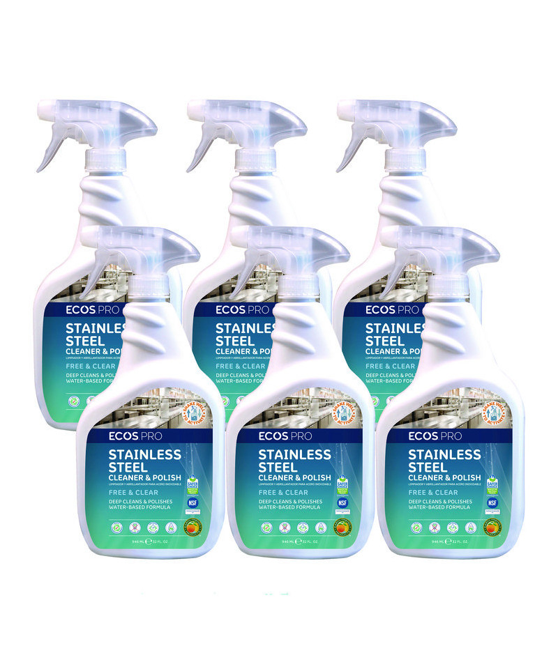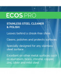The ECOS PRO reliable and effective water-based formula cleans, polishes, and protects stainless steel surfaces. The cleaner will not leave streaks, hazing, or oily residues behind. Protects against water spots and fingerprints and formulated to perform without harsh fumes. Excellent on other metal surfaces such as aluminum, brass, chrome, copper, zinc, silver, and mild steel. The pH-balanced formula is made using sustainable, plant-powered ingredients, is free of dyes, and is gray water and septic safe. Not tested on animals. Manufactured in a facility that is LEED Zero Carbon, LEED Zero Waste, and LEED Zero Energy Certified.
