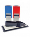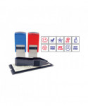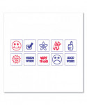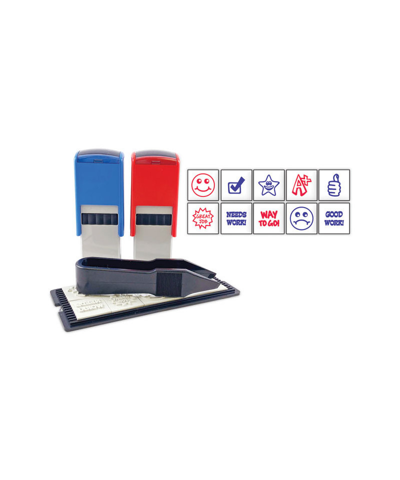 Contains 10 interchangeable dies to be inserted into two stamp mounts -- blue and red. Perfect for marking homework and tests. Self-inking stamps re-ink automatically after each impression for quick, repetitive use.
