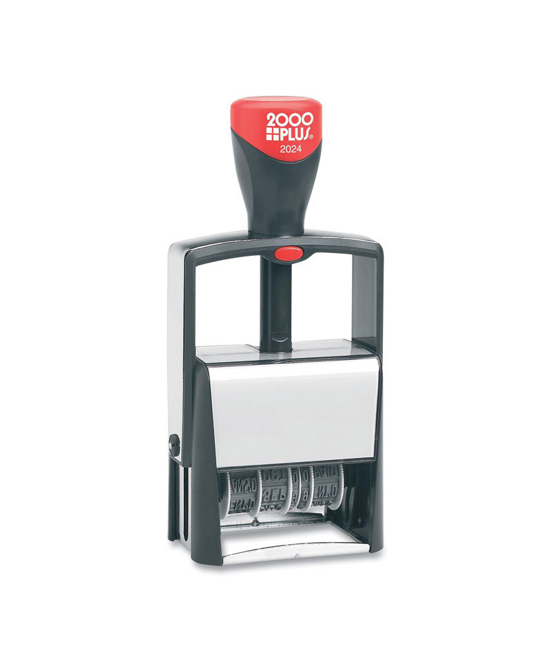 Add dates and important messages to office memos, invoices and receipts. Simply turn the dials to select the proper message or date for your documents. Months, days and five-year band. Includes phrases on year band: REC'D, ENT'D, ANS'D, PAID, SHIP'D, CHG'D, RET'D, BAL, CANC, C.O.D., FILED, and FILLED. Stamp lasts for thousands of impressions. Can be re-inked with 2000 Plus® self-inking refill ink.