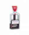 Combines a word and date. Four-band date; months, days and five-year band. Plastic frame. Includes cartridge-style two-color (blue and red) ink pad. Type size 1 1/2.