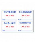 Self-inking message stamp features four interchangeable messages: Scanned, Emailed, Entered and Completed. Two-color pad for message and date. Band Shield Technology prevents ink from coming into contact with your hands and fingers during the date-changing process. Ink colors: red and blue. Five-year date band. Perfect for office use.