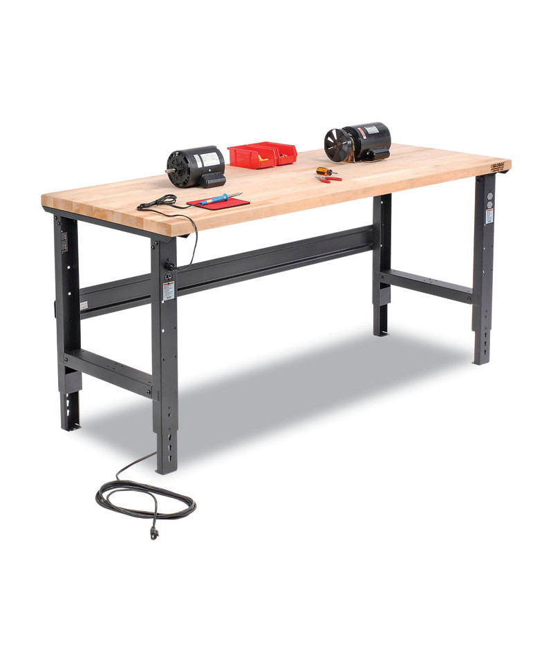 This workbench creates a versatile and adaptable industrial workspace. With a smooth, non-conductive work surface and a C-Channel leg design, this adjustable height workbench provides durability and stability to withstand daily use in various applications. Featuring removable duplex knockouts, you can install outlets to create a powered workbench.