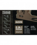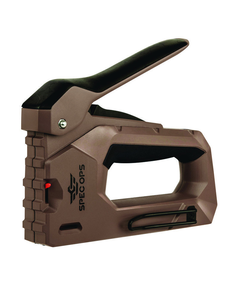 The 2-in-1 heavy-duty staple gun/brad nailer features Spec Ops patented Torsion Spring Technology for up to 50% easier squeezing that reduces hand fatigue and increases accuracy. Up to 25% lighter design with a military grade composite housing, this staple gun is light on the belt yet delivers extreme staple driving power. With a patented, flip-out wire guide, this hand stapler allows for precision stapling over cables and includes a low fastener indicator for added convenience. The all-metal, reversible belt hook is designed for left- and right-hand access. Utilizes heavy duty, T50 style staples (1/4-in, 9/16-in) and 18-gauge brads (1/2-in to 5/8-in). Perfect for insulation, house-wrap, fabric, upholstery wood or furniture repair. The bottom load design allows for rapid re-loading and fail-safe jam clearing. We support our nation's heroes by donating 3% of proceeds to veteran and first responder causes.