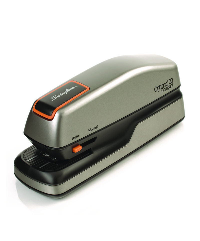 Get reliable, handheld stapling with the Optima 20 Stapler.Jam Free guaranteed for fast, high-volume stapling when used with Swingline S.F.® 4® Premium or Optima Premium Staples. Staples up to 20 sheets at once. Operates quietly without compromising power or speed. Easily switch between stapling modes with the user control switch. Features automatic and manual stapling modes for flexible operation. QuickLoad technology for easy staple reloading. Eject empty staple magazines with the press of a button. Built-in Intelligent Paper Alignment Guide and Stack Height Gauge assist in accurate staple placement and sheet count measuring. Operate using battery power or with the included AC adapter. Four AA batteries required (not included). Not compatible with rechargeable batteries. 100% performance guarantee.