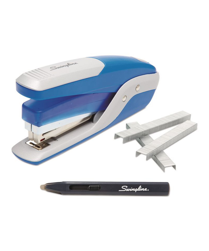 Stapler offers powerful performance for effortless stapling that is Jam Free Guaranteed when used with Swingline® S.F.® 4® Premium Staples. This stapler uses a stored energy system that provides a boost of power to eliminate the need to push harder as sheet counts increase. Stapling two sheets or 28 sheets is equally easy. This stapler also features QuickLoad™ to make refilling easier and has a lightweight, ergonomic design and non-slip base for desktop or handheld use. Three piece value pack includes the Quick Touch™ Full Strip Stapler, S.F.® 4® Premium Staples and Ultimate Staple Remover.