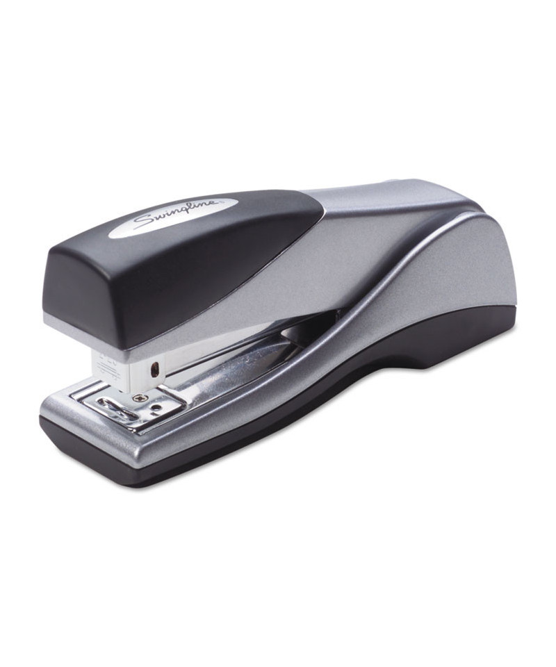 Ergonomically designed specifically for handheld use-the compact size makes it ideal for smaller hands. Delivers 25% greater capacity than other desktop staplers. Jam-free from the first staple to the last with Swingline® S.F.® 3® staples. Streamlined design lets stapler stand vertically or sit horizontally. Sturdy metal construction with soft-feel material for enhanced handheld comfort. 2 1/8" throat depth. Loads a half strip (105) of 1/4" standard staples.