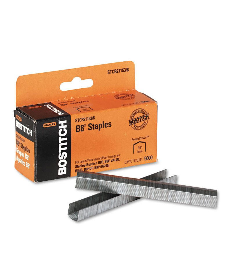 Originally patented in 1932, Bostitch® B8® PowerCrown™ staples staple up to 50% more sheets than standard staples. The unique PowerCrown™ design forces the staple legs outward during the drive, increasing staple strength and reducing effort. The longer length provides up to 50% more sheet capacity making it the ideal staple for use in office environments. These staples are made from the finest quality wire and feature finely honed chisel points for maximum penetration.