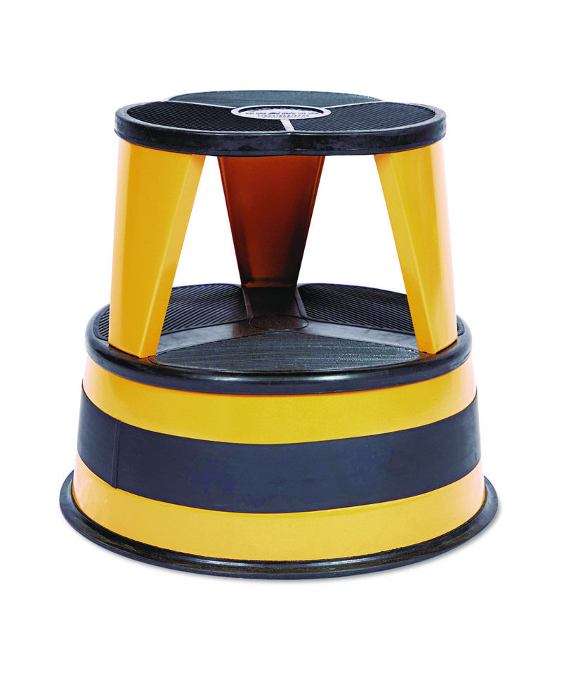 Spring-mounted casters retract when stool is stepped on. Steel construction with nonslip vinyl treads and protective bumper around base. Ships in two pieces and requires no tools for assembly.