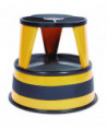 Spring-mounted casters retract when stool is stepped on. Steel construction with nonslip treads. Protective bumper around base. No tools required; simple snap-together assembly.