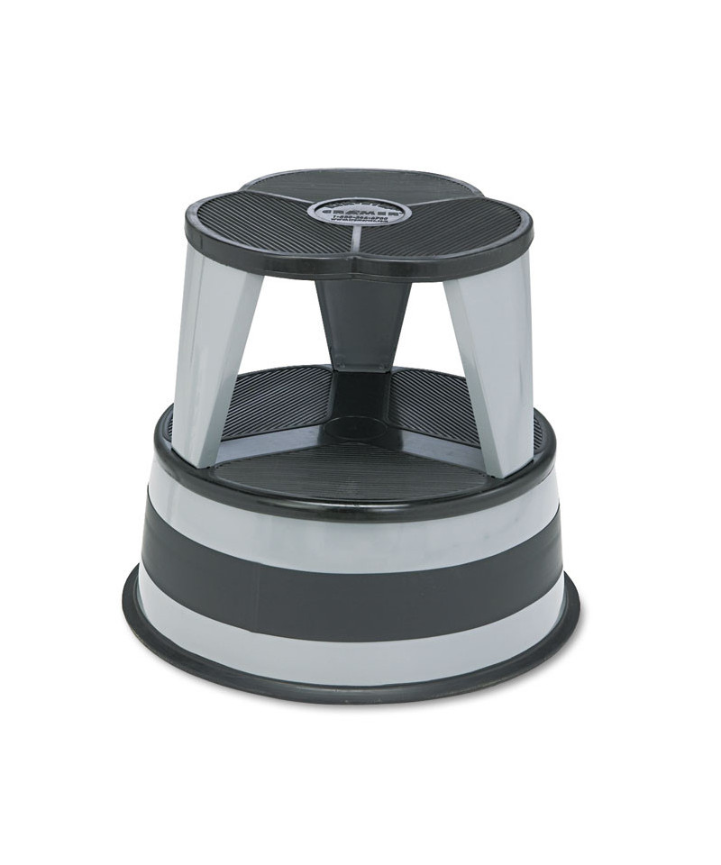 Spring-mounted casters retract when stool is stepped on. Steel construction with nonslip treads. Protective bumper around base. No tools required; simple snap-together assembly.