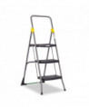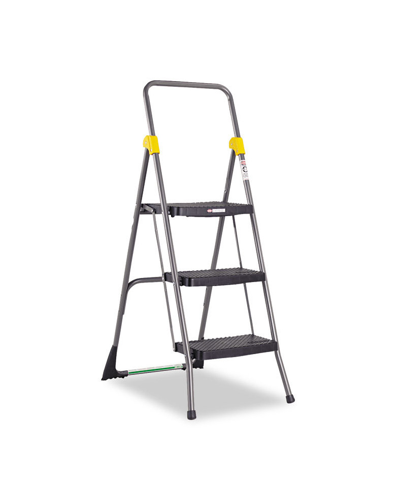 Large 14 1/2w x 12 1/4d top platform step; steps have nonskid treads. Folds for easy storage. Durable, tubular steel frame forms handrail and knee brace. WARNING: Metal ladders conduct electricity. Do not use where contact may be made with live electrical circuits.