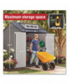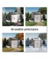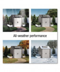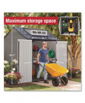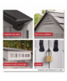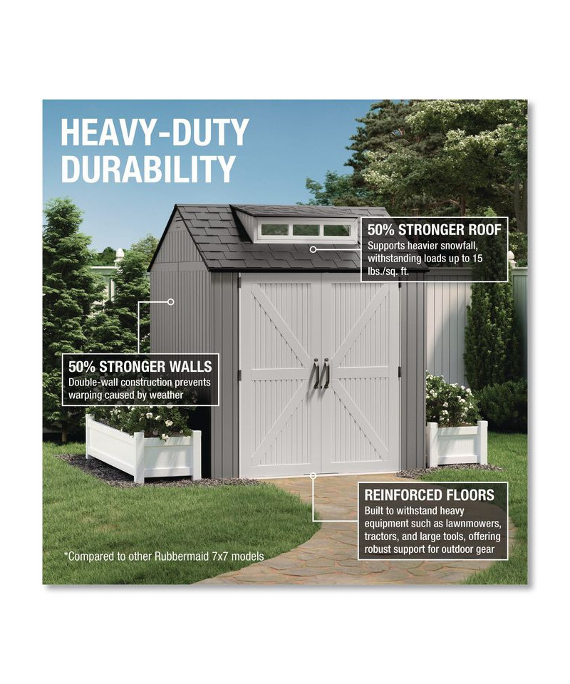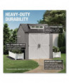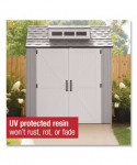 Made of durable resin that won't rust or rot, providing weather resistance all year long. This storage shed is faster and easier to assemble than the previous model. This storage shed stores large lawn care essentials, sporting equipment, garden tools, bicycles and more.