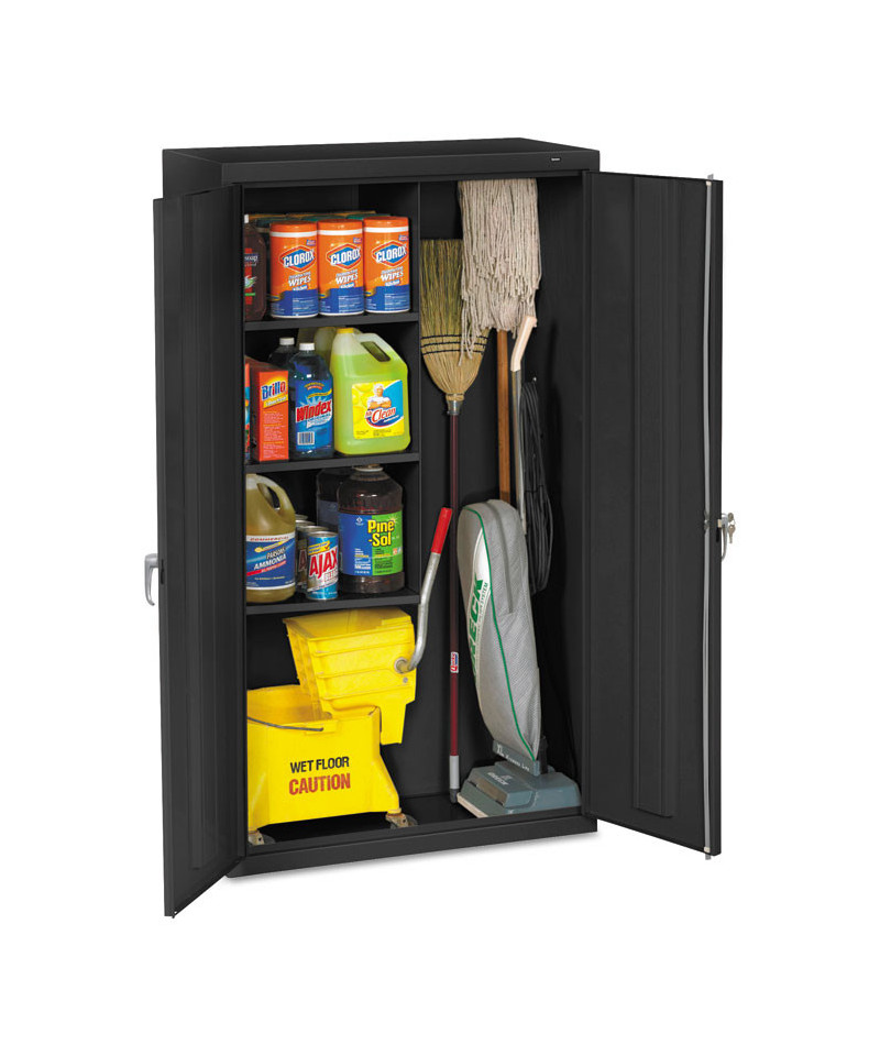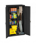 Commercial grade janitorial assembled steel storage cabinet. Fully assembled and ready for immediate use. Heavy-duty construction built to handle all your janitorial storage requirements. Two brushed chrome handles. Right handle uses three-point keyed locking to secure both doors. Three half shelves and tall storage compartment to accommodate brooms and vacuums. Storage cabinet is electrostatically painted with a tough, long lasting powder finish to ensure years of lasting beauty.