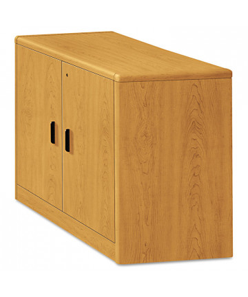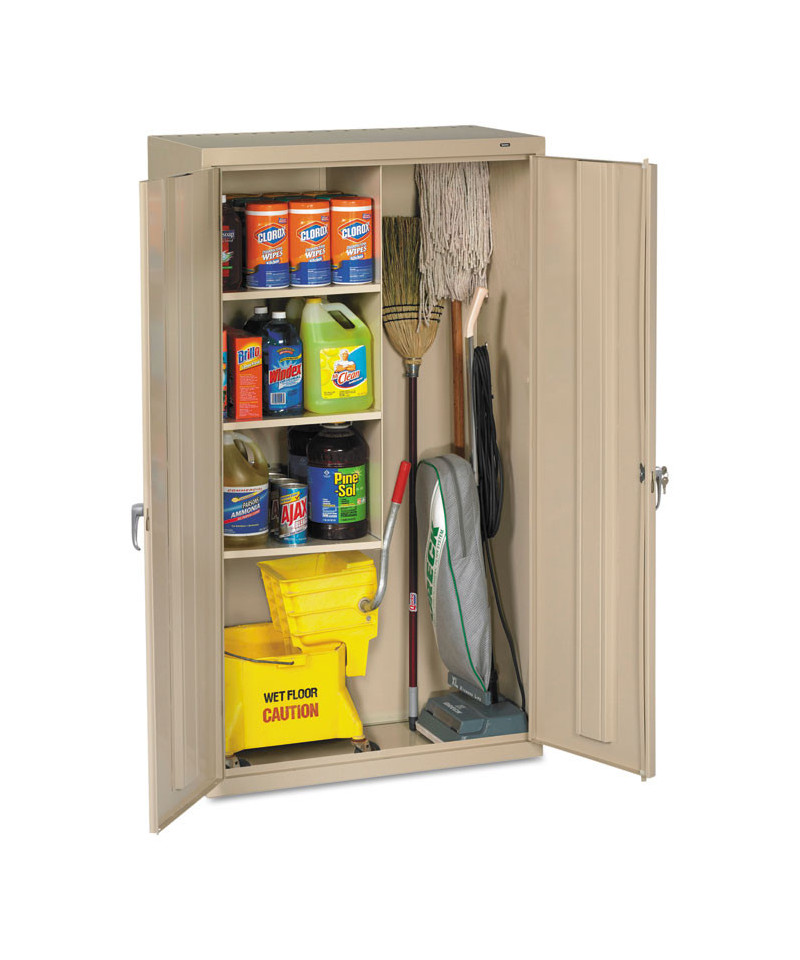 All-welded steel construction with pan-style bottom. Three half-shelves plus extra-tall storage space for brooms, vacuums and more. Reinforced door stiffeners. Locking handle with keys for security.