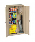 Commercial grade janitorial assembled steel storage cabinet. Fully assembled and ready for immediate use. Heavy-duty construction built to handle all your janitorial storage requirements. Two brushed chrome handles. Right handle uses three-point keyed locking to secure both doors. Three half shelves and tall storage compartment to accommodate brooms and vacuums. Storage cabinet is electrostatically painted with a tough, long lasting powder finish to ensure years of lasting beauty.