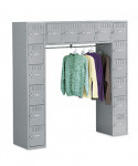 Space efficient design features two six-compartment vertical units, one four-compartment horizontal unit and 48" wide coat bar.