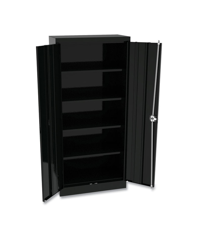 Alera Space-Saver Assembled Storage Cabinet is fully assembled and ready for immediate use. Built with commercial grade steel and reinforced doors for long-term performance at an attractive price. Recessed handle provides easy access without handles obstructing narrow aisle ways. Five openings and 150 lb capacity per shelf. Storage cabinet is electrostatically painted with a tough, long lasting powder finish to ensure years of lasting beauty. Shelves adjust in 2" increments without tools. Raised base keeps contents out of harm's way from cleaning liquids. Doors open 180° for easy access to contents. Four adjustable shelves.