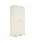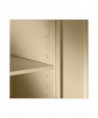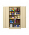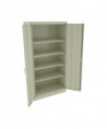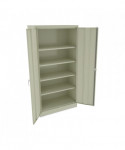 Assembled storage cabinet with three-point locking bar system locks top, bottom, and doors. Durable, reinforced doors with satin chrome double handles open 180° for easy access to contents. Industrial-grade steel with powder coat finish for long lasting use. The sturdy, 16-gauge door frame prevents racking. Heavy duty secure knuckle hinges for longevity. Built-in leveling glides help compensate for uneven floors.