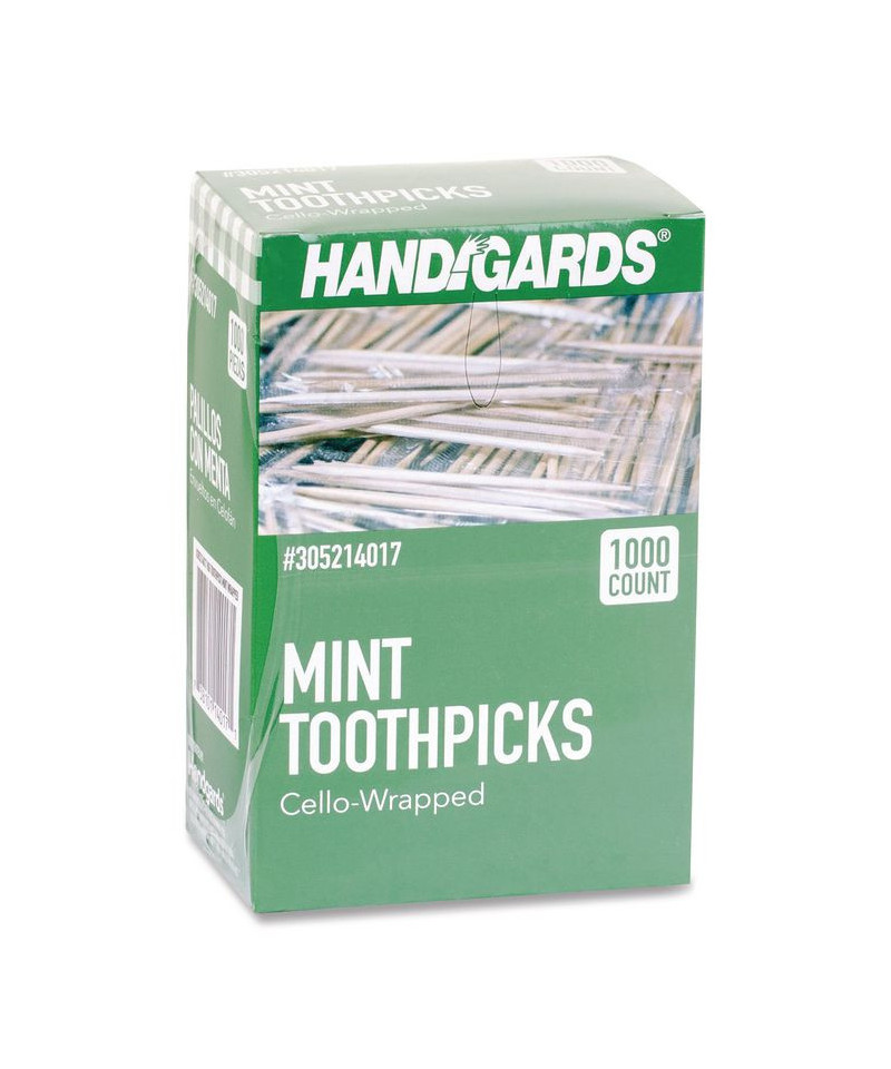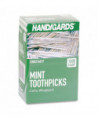 Handgards Mint Toothpicks offer a fresh, mint flavor to a traditional after dinner offering. A superior fit to meet your unique needs, individually wrapped in cellophane for sanitary dispensing, which is perfect for your establishment. Put your guest at ease knowing their toothpicks are sanitary with added protection against germs. These toothpicks are made of smooth white birch and packaged in a self-dispensing box.