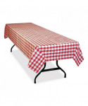 Heavyweight plastic tablecloths help protect tabletop from spills while adding a little color to your table setting. Reusable and disposable. Each 54" x 108" tablecloth fits one banquet-size table or two card tables for plenty of seating space.