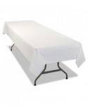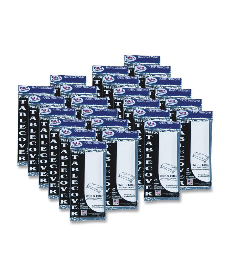 Heavyweight plastic tablecloths help protect tabletop from spills while adding a little color to your table setting. Reusable and disposable. Each 54" x 108" tablecloth fits one banquet-size table or two card tables for plenty of seating space.