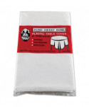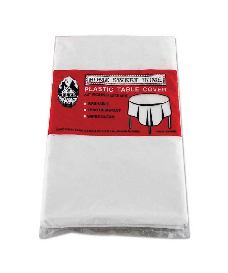 Disposable, heavy-duty plastic. More coloring is used in the manufacturing process of these table covers making them less susceptible to being able to see through when placed on a table. 1.70 mil thick.
