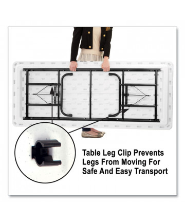 Wear-resistant, 3/4" thick melamine top with vinyl T-mold edge. Melamine sealed underside helps prevent moisture absorption. Full perimeter steel skirt support with plastic corners to protect surface when stacking. 1" diameter, heavy gauge steel legs with heavy-duty foot caps to protect floors. Heavy-duty leg supports and gravity leg lock for secure set-up. Folds to 2-1/2" for compact storage.