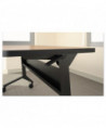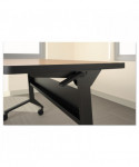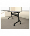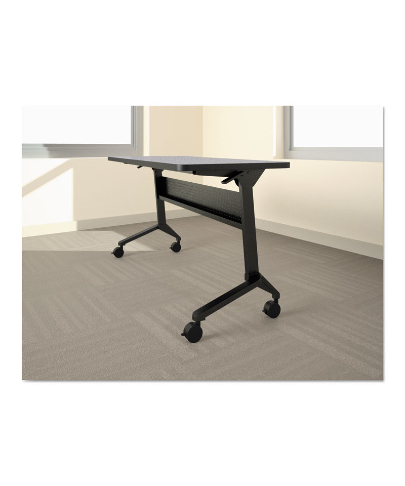 Dual-sided levers for a quick-flip of the top. Tables nest for compact storage. Steel base with integrated modesty panel with built-in cable trough. Four locking casters.