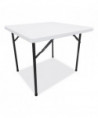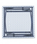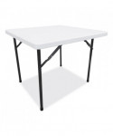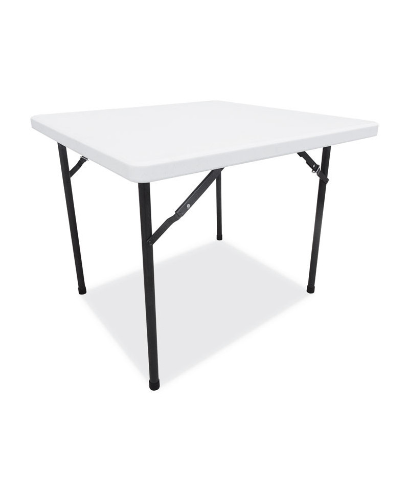 Versatile folding table is perfect for indoors or outdoors. Convenient square, folding table sets up quickly when you need an extra table and space is limited. Blow-molded polyethylene top is water and stain resistant to ensure it won't crack or stain. Strong, durable, powder-coated metal construction withstands dents and scratches. Slide lock feature enhances table stability once opened. Legs fold flush into table creating a flat surface for easy storage and stacking. Non-marring foot caps prevent floor damage. Supports up to 600 lbs of evenly distributed weight.