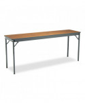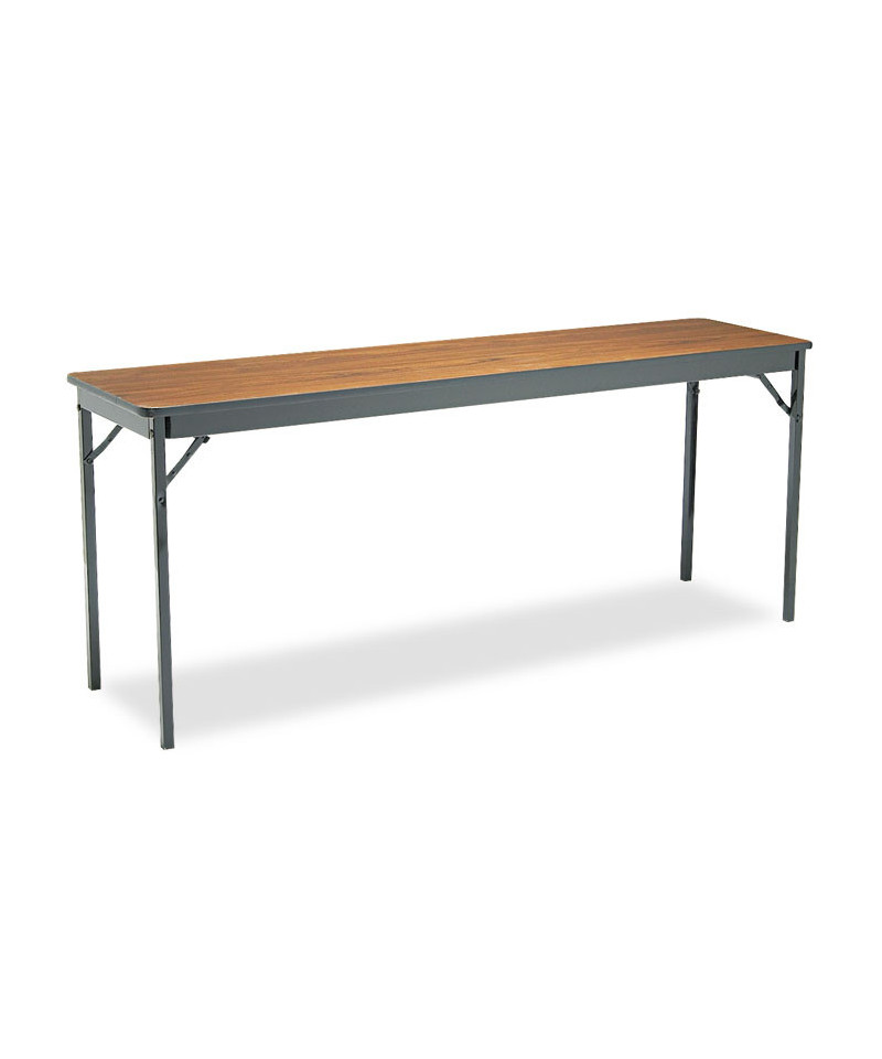 Security lock holds table firmly open. End seating is unobstructed. Easy-care 0.75" thick walnut laminate top. 2.25" steel apron for support. Black apron and legs. Open height: 30". Folds to just 4" high for easy storage.