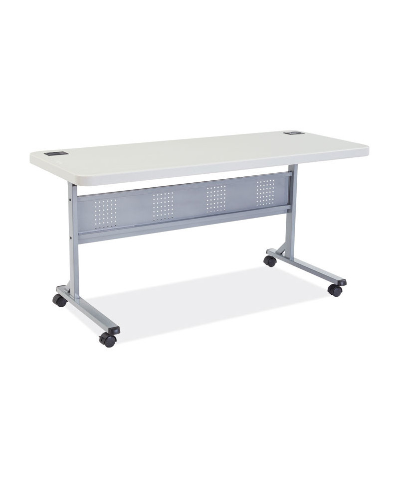 The Flip-N-Store, our blow-molded polyethylene flipper table, is a fantastic addition to any training/conference room or seminar set-up. Its smoothly textured high-density plastic surface flips open and closed with a dual-lever mechanism for amazingly convenient use and storage. Simple to clean and lightweight, the tables also nest together to save space and roll with ease on four 2 casters (two locking). These units feature a reversible modesty panel made of perforated steel with a built-in cable channel as well as removable dual grommet holes for wire management while keeping electronic devices connected and charged. The powder coated frame and legs are made of strong powder-coated steel and boasts a weight capacity of 700 lbs. Affordable and a cinch to assemble, you'll flip for the Flip-N-Store!
