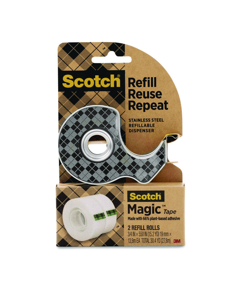 Grasp empty tape core and remove. Replace with a new tape roll. Refill. Reuse. Repeat: reuse the handheld stainless steel office tape dispenser for life, refill with any Scotch Brand Tape and repeat with the included refill roll. Metal blade cuts tape effortlessly, use caution with the sharp blade. For any home looking to use more plant-based materials, turn to Scotch Tape for your favorite tape projects, like labeling, light hanging, repairing, decorating and more. Made with 66% plant-based adhesive, this tape has the same great performance you know and expect from the original Scotch Magic Tape. This plant-based adhesive tape has the strength and holding power and disappears just like the original, tried-and-true Magic Tape. With a matte finish, this tape provides a clean finish that blends nicely on a variety of surfaces. It is perfect for fixing torn or ripped documents such as birth or wedding certificates and is great for school projects, because you can write on it with a pen, pencil, or marker. The starter pack includes one refillable and reusable handheld Scotch Stainless Steel Tape Dispenser and two rolls of 0.75 in x 550 in Scotch Magic Tape made with 66% plant-based adhesive.