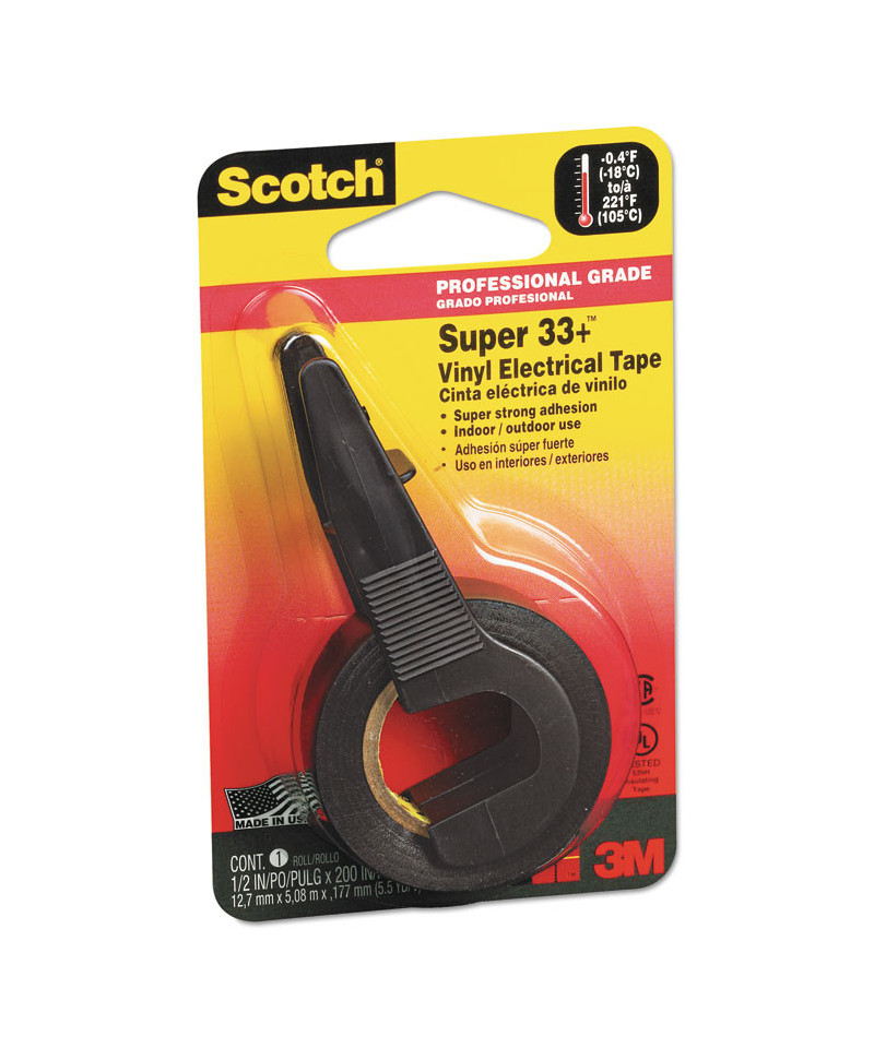 Scotch® Super 33+ Vinyl Electrical Tape is among the highest-quality electrical tapes available. Highly conformable and super stretchy in all weather applications, it resists UV rays, abrasion, corrosion, alkalis and acids. May be used as primary insulation for splices up to 600V. Suitable for indoor and outdoor use.