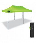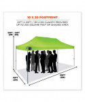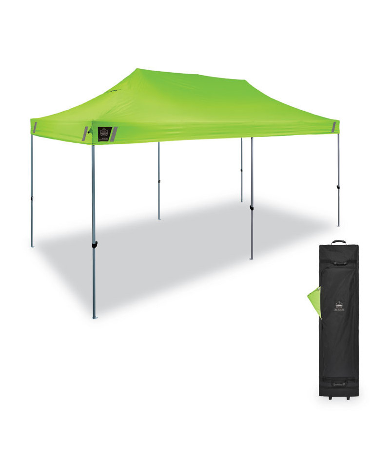 The SHAX 6015 Heavy-Duty Pop-Up Tent is a durable portable shelter providing fast, long-lasting relief from the sun, wind, and rain with a 10 ft x 20 ft footprint. The powder-coated steel frame is built to withstand the elements and won't easily bend or rust like aluminum. ABS plastic sliders on the adjustable legs are more durable and easier to adjust compared to other tents that have push-pins. This portable tent offers three different heights ranging from 9.8 ft to 10.8 ft. Made with thick, high-quality 300-denier polyester material, this heavy-duty 10 ft x 20 ft canopy also boasts waterproofing polyurethane coating (PU) and UV treatment as well as reinforced corners to withstand tough conditions. A double-vented top allows maximum air flow, while the hi-vis lime color and silver coating on interior provide increased visibility on busy jobsites or at events.