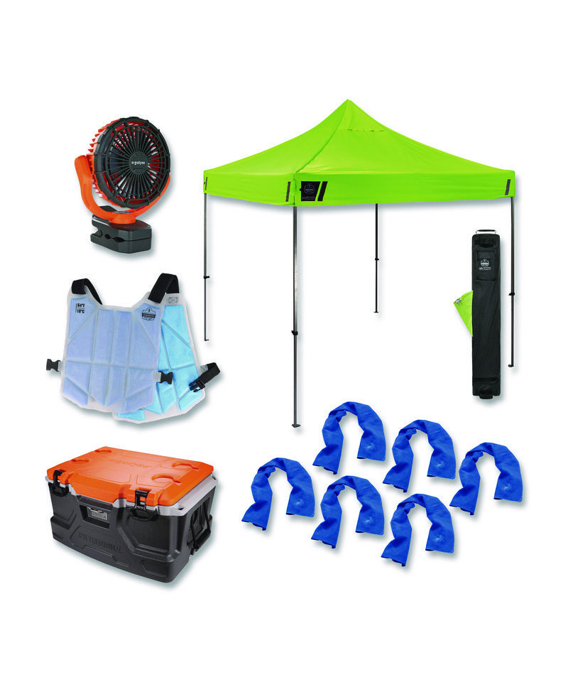 The Chill-Its 6672 Heat Stress Prevention & Recovery Station Kit provides a comprehensive set of solutions for water, rest and shade to help prevent heat stress and minimize heat exposure. Employers are legally required to maintain a safe workplace free from known hazards, including extreme heat, and this all-in-one kit offers an effective way to safeguard work crews and stay cool on the job. Chill-Its 6602 Cooling Towels are hyper-evaporative PVA towels that provide instant cooling relief for up to four hours when wet, remaining soft and bulk-free for comfortable wear around the neck or head. Chill-Its 6210 Phase Change Cooling Ice Vest weighs less than three lbs and is designed in a one size fits most manner. This cooling phase change vest provides immediate relief to the core by maintaining a constant temperature of 64°F for up to two hours and can recharge in just 10 minutes. Chill-Its 6090 Rechargeable Portable Jobsite Fan is a portable fan powered by a rechargeable lithium-ion battery, making it suitable for both indoor and outdoor use. Featuring a 360° rotating head, two air speed settings and a heavy-duty clamp for secure attachment, it offers versatile mounting options with quiet operation. SHAX 6000 Heavy-Duty Pop-Up Tent 10 x 10 foot canopy provides 100 square feet of shade with a durable steel frame and reinforced corners, ensuring it withstands tough conditions. Designed for versatility, it features UV protection, adjustable heights and a double-vented canopy for airflow. Chill-Its 5171 Industrial Hard Sided 48-qt Cooler, that doubles as a stool, can hold up to 72 cans or 40 water bottles and features polyurethane foam insulation that keeps contents cool for up to 30 hours.