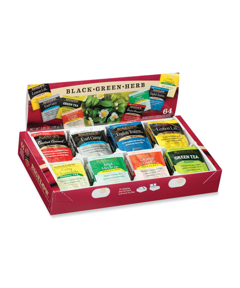 Individually overwrapped tea bags. You are cordially invited to tea. Includes Constant Comment Tea: famous delicious blend of fine tea flavored with golden orange rind and sweet spice; Earl Grey Tea: named after a British nobleman this tea is renowned in international circles; English Teatime Tea: in the best English tradition a full-bodied tea ideal for all occasions; Lemon Lift Tea: lemon and spice give this tea delightful refreshing flavor; Cozy Chamomile Herb Tea: relaxing herb tea is delicate and soothing; Mint Medley Herb Tea: refreshing blend of peppermint and spearmint; Orange & Spice Herb Tea: delightful blend of orange and spice; Green Tea: fine delicate tea in the Japanese style.
