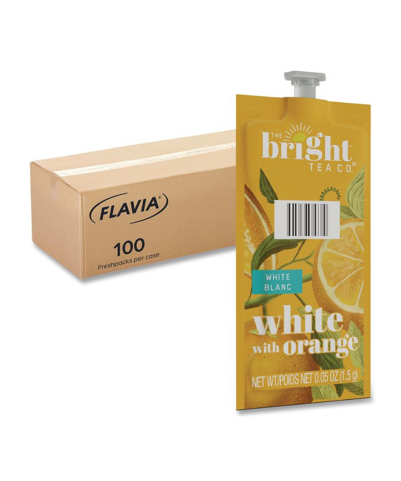 Delight in the smooth, subtle flavors of The Bright Tea Co.® White with Orange Tea Freshpack, offering a delicate orange flavor and a fragrant, refreshing aroma. Crafted through a unique brewing process where only hot water touches the ingredients, every sip delivers a pure, fresh taste with no remnants of previous brews. Perfectly compatible with FLAVIA® single-serve brewers for quick and convenient enjoyment. Plus, the innovative pouches are 100% recyclable through Terracycle, making it a sustainable choice for your tea break. Enjoy a fragrant tea experience, one cup at a time.