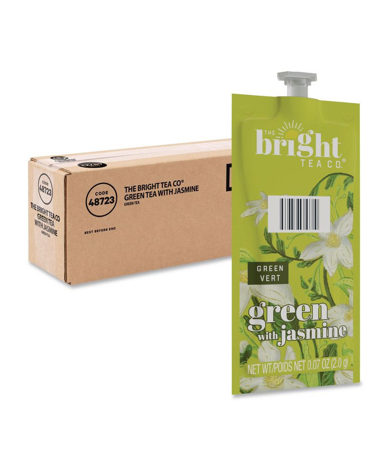 Experience the delicate balance of flavor with The Bright Tea Co.® Green with Jasmine Tea Freshpack. This light-bodied tea delivers a refreshing taste and the fragrant aroma of jasmine, creating a soothing and uplifting experience in every cup. Crafted with a unique brewing process where only hot water touches the ingredients, ensuring a pure, fresh taste free from previous brews. Fully compatible with FLAVIA® single-serve brewers for effortless brewing, it’s perfect for those who appreciate convenience without compromising on quality. Plus, the innovative pouches are 100% recyclable through Terracycle, offering a sustainable choice for your tea break. Enjoy a truly aromatic experience with every sip.