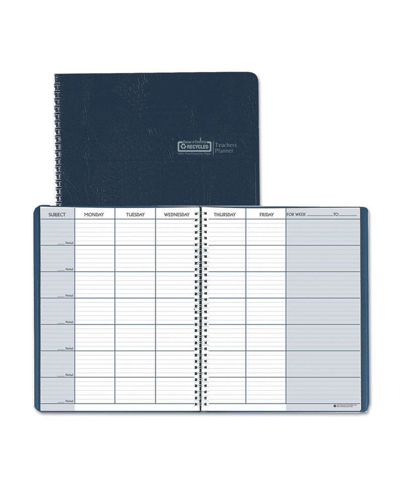 Handy teacher's helper features 45 undated weekly spreads, each divided into seven periods, with space for notes. Includes seating chart, test and attendance records and term program. The planner is bound strongly with wire-binding and the cover features a blue, embossed leatherette finish. Made entirely of recycled materials.