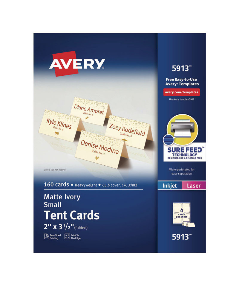 Fold-over rectangular cards sit atop any flat surface for great visibility. Card stock is ideal for name cards in meetings, presentations, seminars and classrooms. Use as place cards for marking "reserved" seating at tables, weddings, catered events or for displaying any type of communication prominently. Ultra-fine perforations let you separate cards cleanly and easily for a professional appearance and are pre-scored for easy folding. Easy to customize with free designs and templates from Avery Design & Print. 8.5" x 11" sheets for laser and inkjet printers.