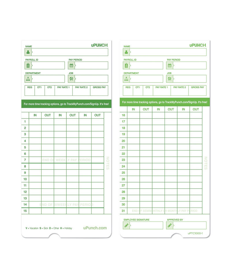 Track your employees’ time clock punches on these high quality uPUNCH™ time cards. Use up to six columns for start time, break times, lunchtimes and finish time for all your employees.