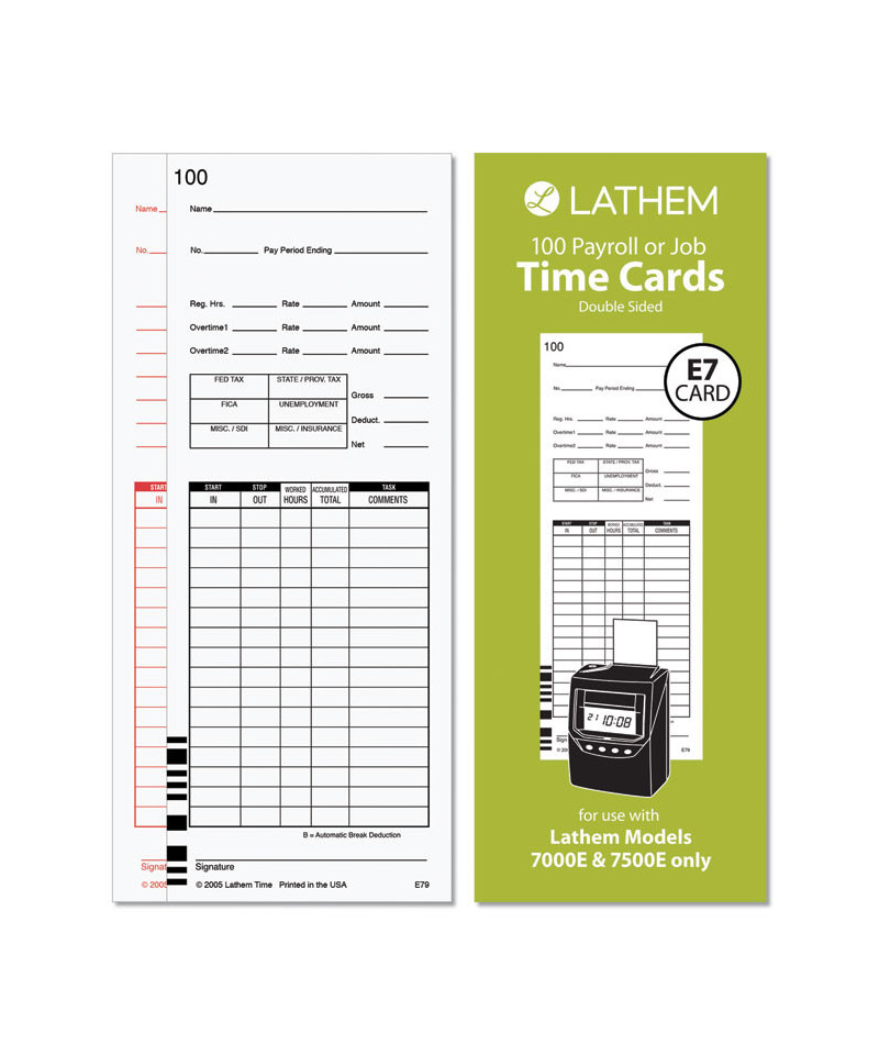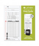 Record daily details precisely with these time cards designed for use with Lathem 7000E and 7500E time clocks. Made with heavy-duty stock, these cards are perfect for industrial, food service, or general office applications. Featuring black print on the front side and red on the back to ensure correct use, these Lathem time cards are numbered and bar coded to make record-keeping easy. Spots for recording time are easy to read as the time clock imprints text in precise areas. Columns show exactly when an employee clocked in and out during the pay period, while places for a name, signature and pay amount are clearly marked outside of the stamped areas. These time cards work for weekly, biweekly and semimonthly time periods.