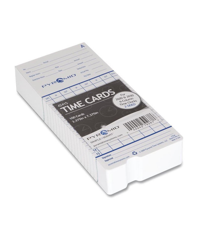 Capture employee data more efficiently by using this 100-pack of detailed time cards. Double-sided with days 1-15 on the front and 16-31 on the back, these compact cards record regular hours, overtime, deductions, and several other key items all in one place, simplifying the payroll process. Made of heavy-duty card stock, cards are durable enough for month-long use and are compatible with Pyramid Series 2000 and 6000 time clocks.