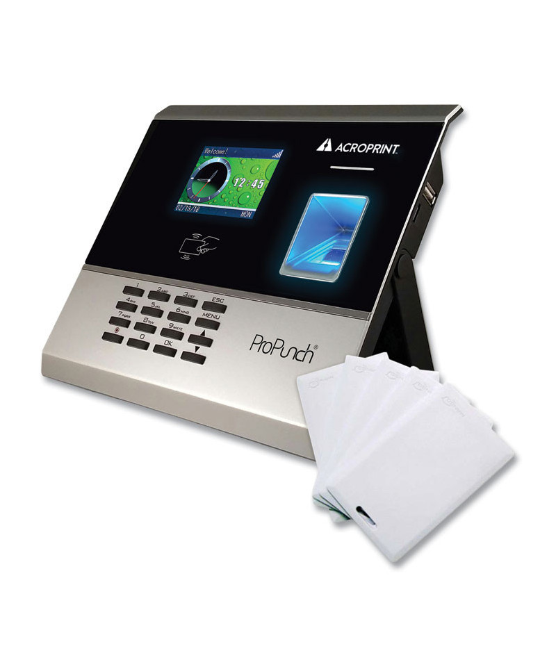 Acroprint ProPunch includes the FPC18 Time Clock and advanced web-based software that installs on your network. ProPunch is ideal for businesses with 10 to 50 employees that are looking for the flexibility of anytime, anywhere access, advanced reporting and direct export of processed employee time to most popular payroll software and services. The FPC18 Time Clock features a built-in fingerprint scanner that makes punching fast and easy. It also enhances employee accountability by preventing buddy punching. The clock has options for PIN punching and an RFID reader for proximity card punching. You can allow your employees to punch and view their account information from any internet connected device. Supervisors and selected administrators can also access ProPunch™ from their smartphone or using a web browser. Customizable to perform complex rounding rules, pay categories and paid or unpaid lunch and break time according to your preferences. This outstanding time and attendance tracking system provides a wealth of reporting options to help you control costs and monitor attendance, including Who's In, Missed Punches and Early and Late Punch reports.