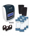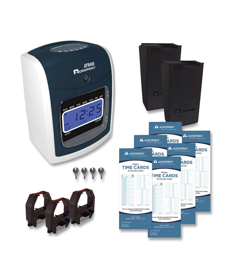 The ATR480 Time Clock automatically calculates and totals employee time for businesses with up to 50 employees. With this time clock, you can set overtime policies, implement rounding rules, and deduct break time to accommodate your payroll needs. The ATR480 supports job costing and can be set to automatically adjust for Daylight Saving Time. This top-loading clock features automatic card positioning and easy-to-read imprints in standard (AM/PM) or military (24 Hour) time. Employee time can be set to record in minutes or hundredths. A two-color printing option makes it easy to spot early and late punches. Use the built-in programmable buzzer or connect to an external signal device to notify employees about shift start and stop times. To enhance security, clock programming can be password protected and the clock case is secured with lock and key to prevent tampering. The built-in battery allows employees to keep punching, even during power outages. Bundle includes three two-color ribbons (one installed, two extra), 300 time cards, two 10-pocket time card racks, four keys, owners manual and power cord.