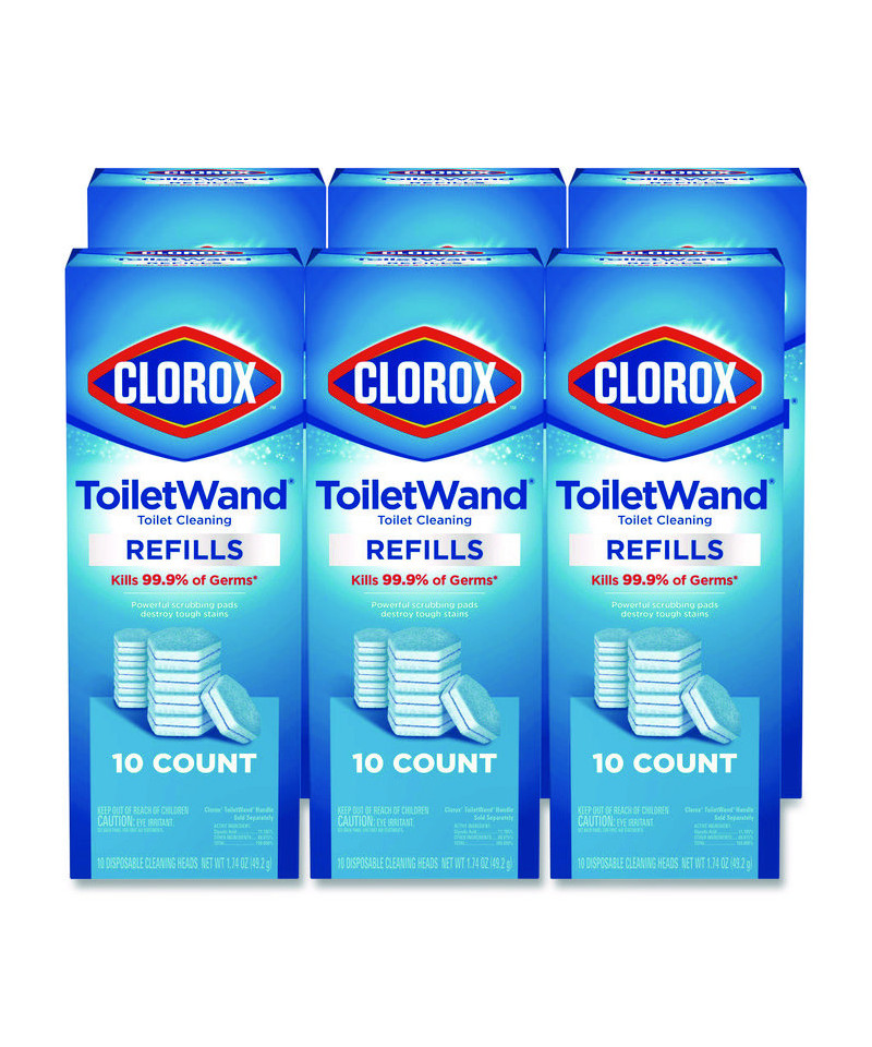 Get a clean start every time with Clorox® ToiletWand® Toilet Cleaning Refills. Each disposable scrubbing pad is preloaded with Clorox® Cleaner that kills 99.9% of germs. Scrubbing pads power through hard water and lime stains 2x faster than when using a toilet brush with manual toilet bowl cleaner. Designed for optimal reach, hexagonal shaped scrubbing pads conform to hard-to-reach areas like under the rim – no more bending and stretching. The fresh scent neutralizes odors without the bleach smell. Use this nonabrasive formula to sanitize a variety of surfaces, including porcelain, chrome, enamel and synthetic marble. Never touch an icky toilet brush again: disposable scrubbing pads conveniently pop off into the trash so you can toss the mess every time.