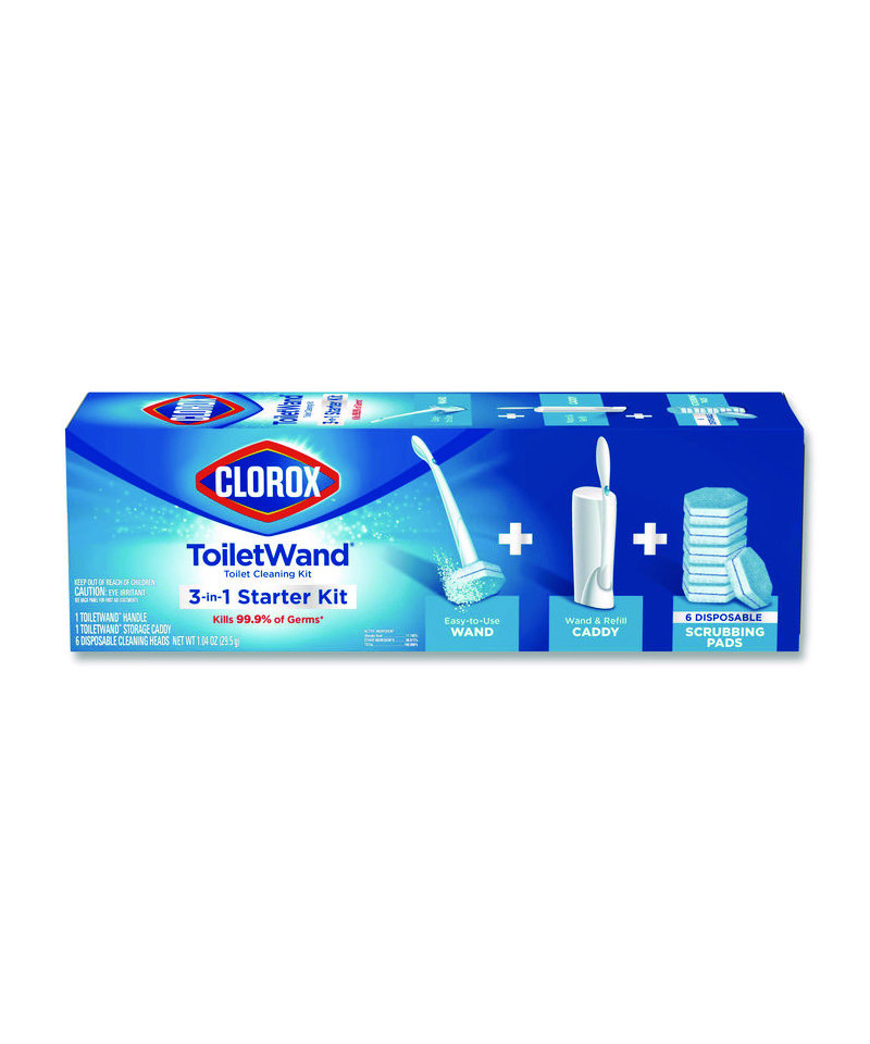 Clorox® ToiletWand® is an easy to use, all in one system that makes the dreaded toilet cleaning experience a breeze. The all-in-one system contains one wand with a long handle to help you clean from a distance, six disposable scrubbing pads preloaded with cleaner and one caddy to conveniently store scrubbing pad refills. Each disposable scrubbing pad is preloaded with Clorox® Cleaner that kills 99.9% of germs. Scrubbing pads power through hard water and lime stains 2x faster than when using a toilet brush with manual toilet bowl cleaner. Never touch an icky toilet brush again: disposable scrubbing pads conveniently pop off into the trash so you can toss the mess every time.