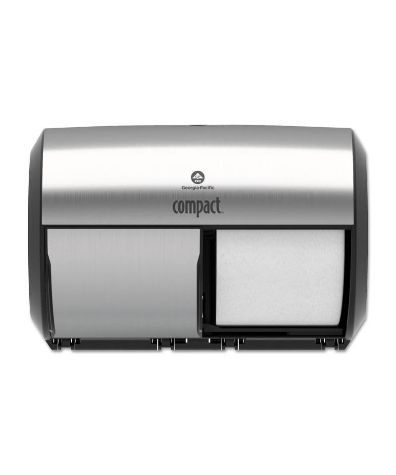 High-capacity coreless tissue system dispenses up to 3,000 two-ply sheets of tissue, which is up to six times the capacity of single standard two-ply rolls while maintaining a professional look. Transfer paddle prevents access to new roll before current roll is completely used. See-through, high-impact plastic cover permits monitoring of paper supply. Holds up to two 5.75" diameter Compact® Coreless rolls (GEP-19375, sold separately). Locking dispenser prevents pilferage.