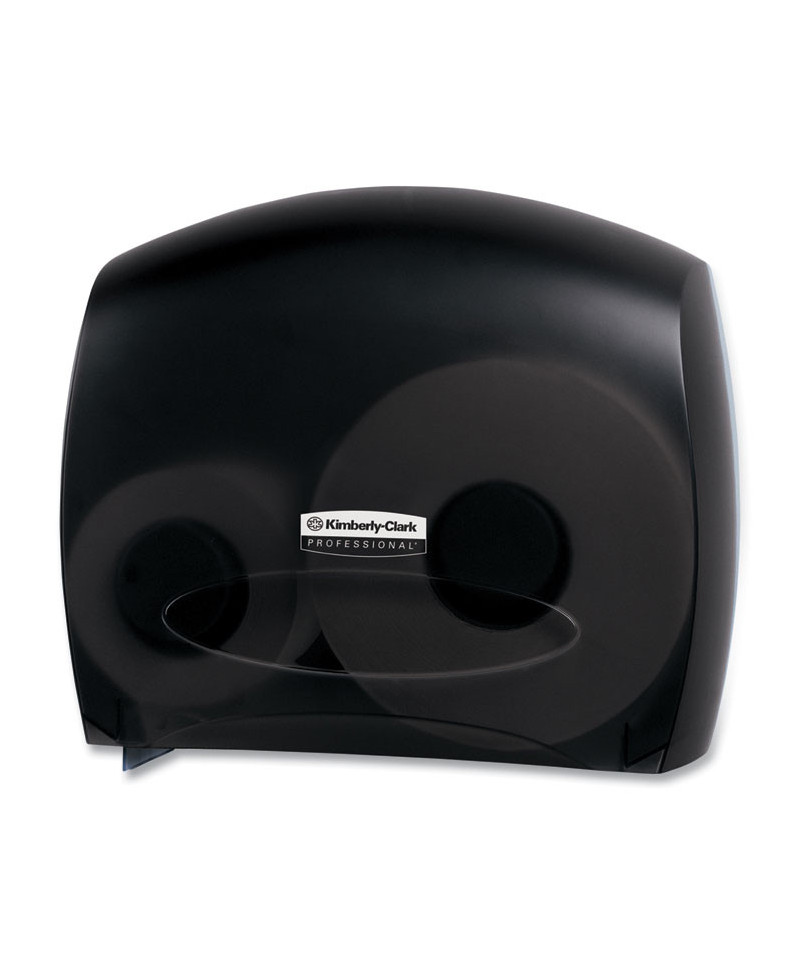 Jumbo bathroom tissue dispenser has a curved design, creating a graceful, contemporary look. Designed for easy access to toilet tissue. Dispenser has a replaceable lock with a push button option, for security and ease of use. Transparent gray plastic easily allows you to see when the paper needs refilling.